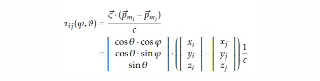 假如有M个传声器,则传声器对有 N= M * (M-1)/2 个传声器对,对于每个传声器对来说,假设声源来的方向可以预估延时用公式表示如下:
