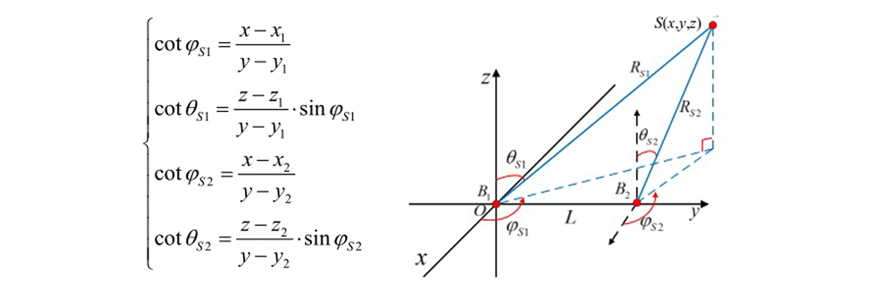 用两个传声器阵列(双阵为例),将每个阵列看作一个点,每个点可以确认一组表示声源方向的角度θ和φ,而假如有L个小型麦克风阵列,则可以得到L组θ和φ,其中声传感器阵列B1测得的方位角为φs1, 俯仰角为θs1;声传感器阵列B2测得的方位角为φs2 , 俯仰角为θs2。传感器B1的坐标原点在全局坐标系中为 (x1,y1,z1),传感器B2的坐标原点在全局坐标系中为 (x2,y2,z2)。通过两条不同方向的直线可以确定一个相交点,则这个点是声源的位置 S(x,y,z)。